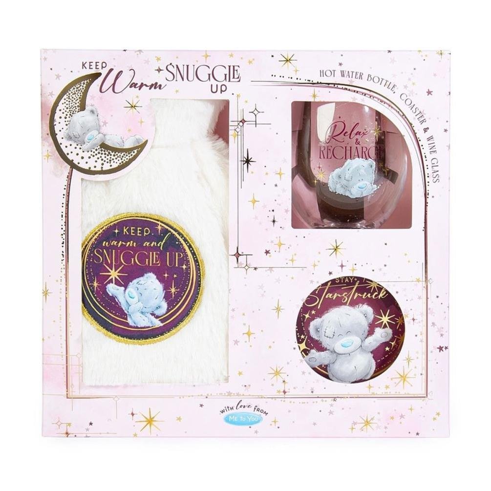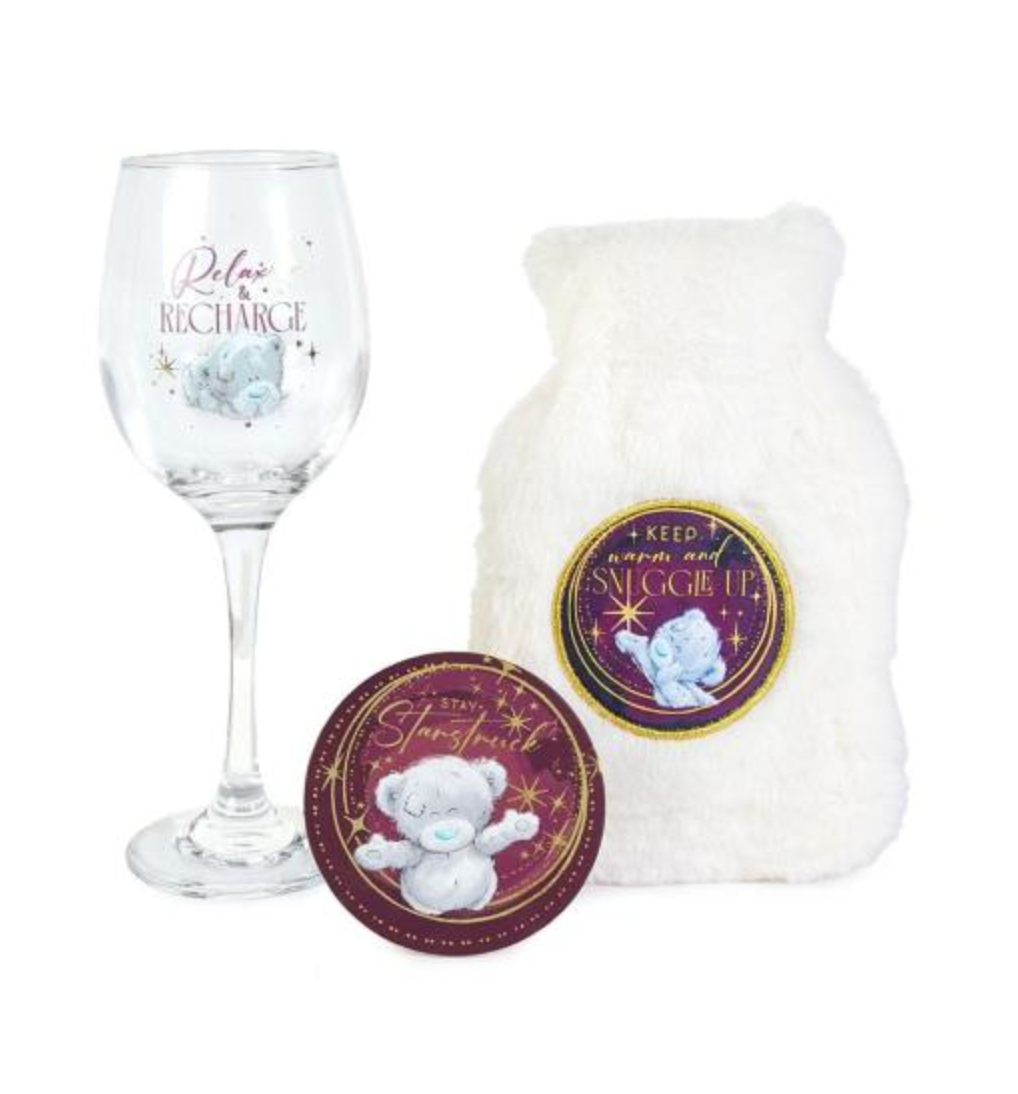 Το σετ διαθέτει μια θερμοφόρα με εικόνα του Tatty Teddy και τη φράση “Keep warm and snuggle up”, ένα σουβέρ με τη φράση “Stay starstruck”, καθώς και ένα ποτήρι κρασιού με εκτυπωμένη εικόνα Tatty Teddy και τις λέξεις “Relax & recharge”. Όλα παρουσιάζονται σε μια όμορφη, θεματική συσκευασία δώρου Tatty Teddy