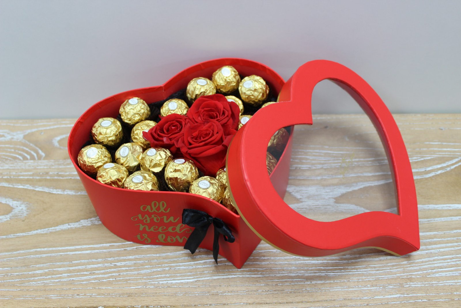 Ένα ρομαντικό και εντυπωσιακό κουτί σε σχήμα καρδιάς που συνδυάζει τριαντάφυλλα και σοκολατάκια, δημιουργώντας το απόλυτο δώρο αγάπης.